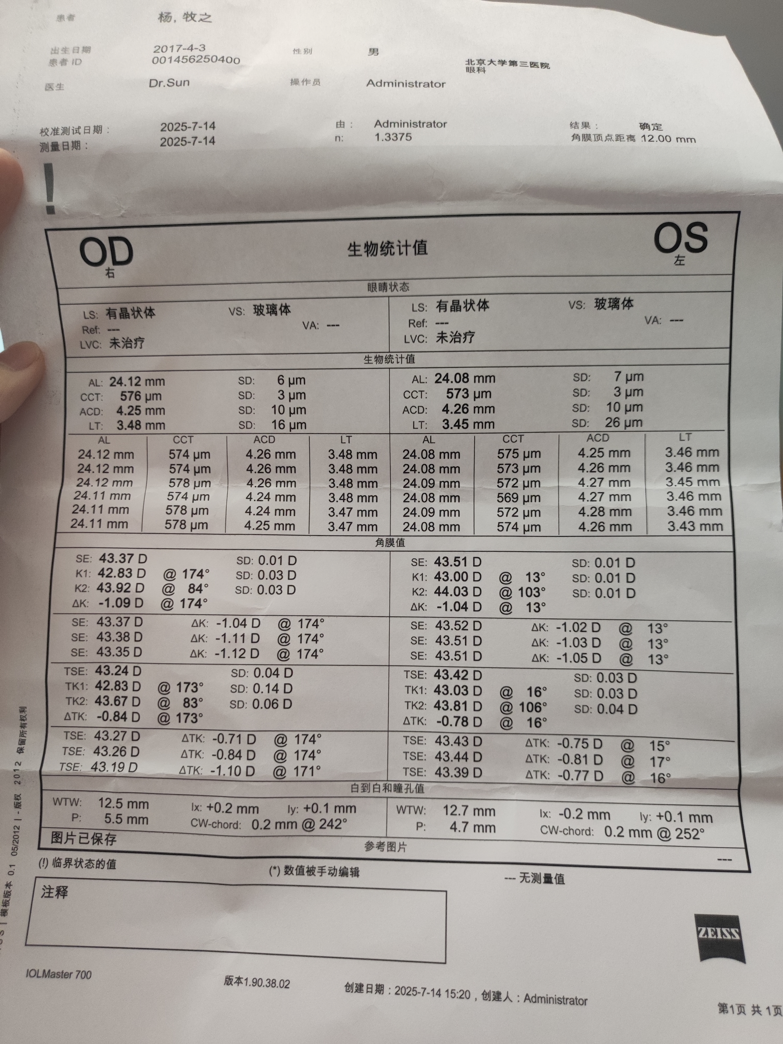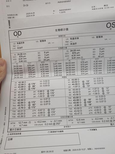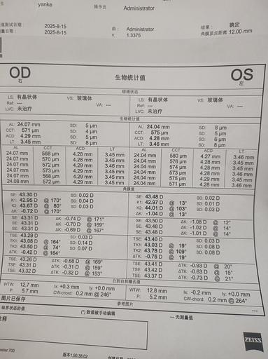 | 平均角膜曲率 | 43.37 | 43.56 | 44以内不陡峭 | 正常,无圆锥角膜风险 |