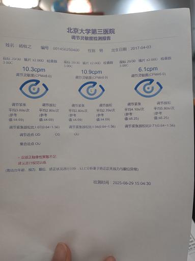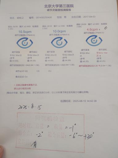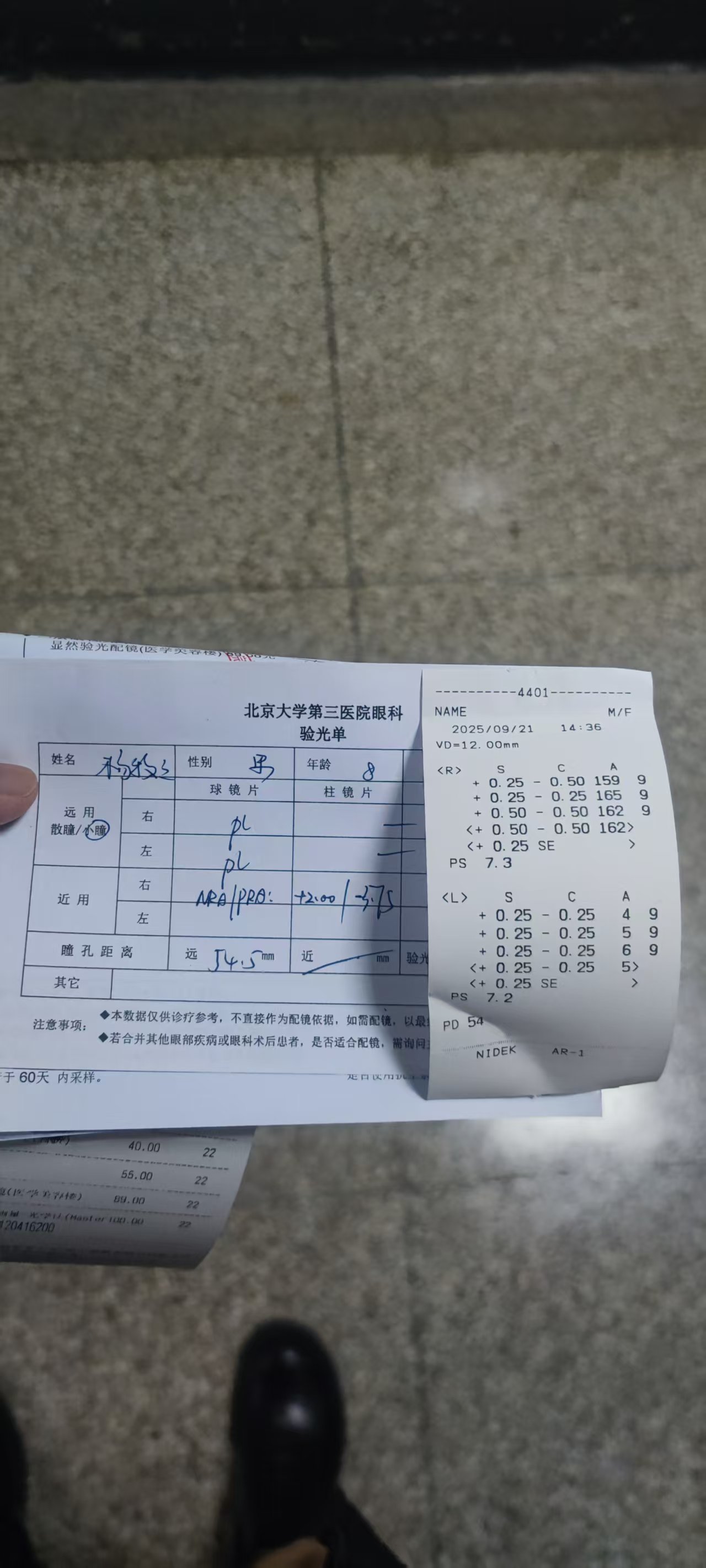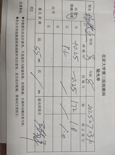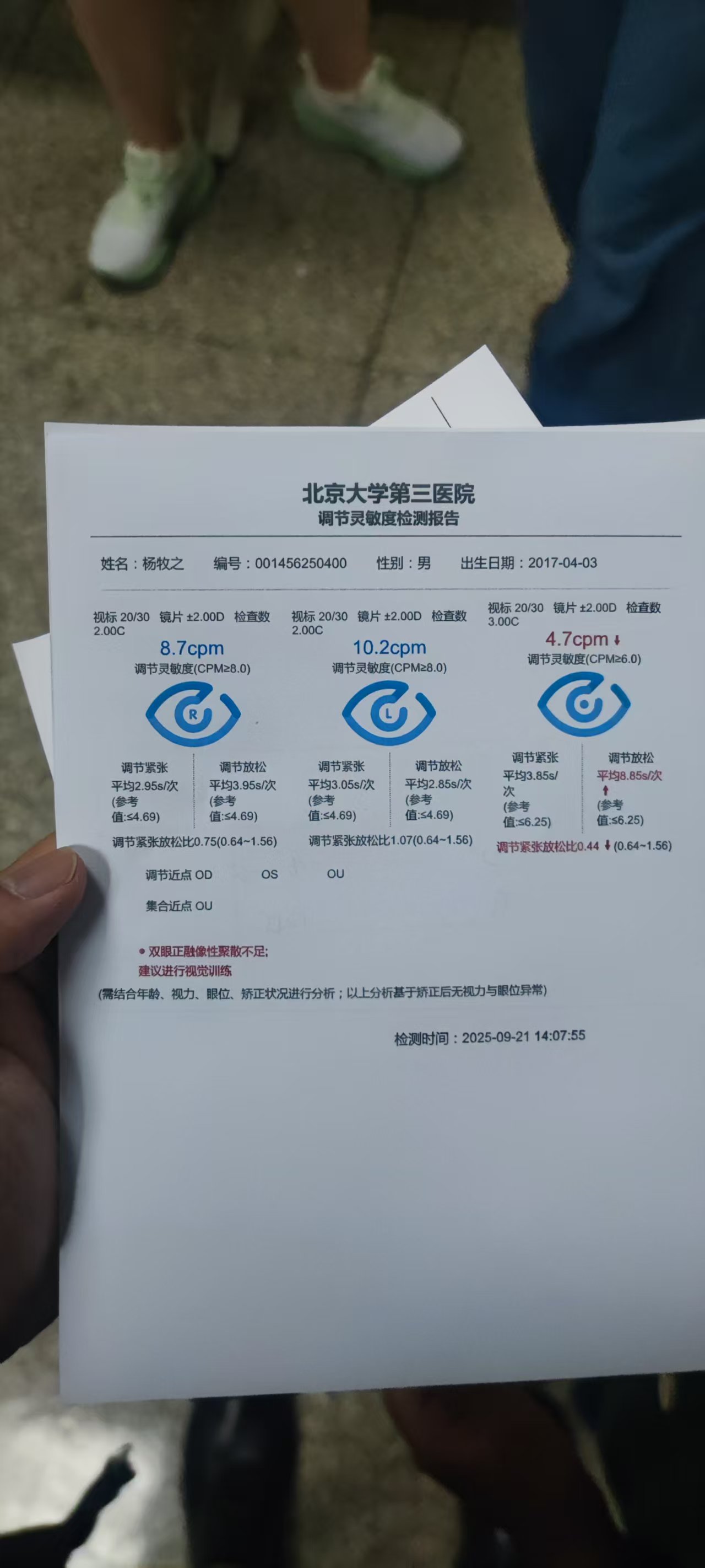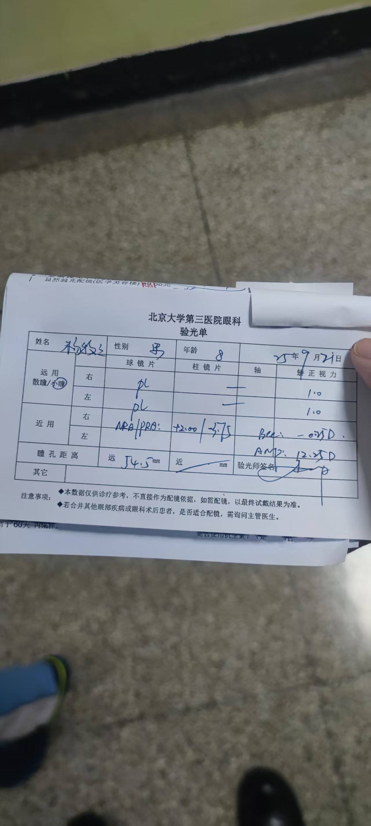 | 眼轴长度 (mm) | 24.06 | 24.03 | 8岁标准:22.7±0.2 | 超安全范围上限(>23.7),发育过快 |