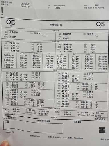 | 角膜散光 | 0.72 D | 1.04 D | <1.5 D(低度数无需足矫) | 右眼正常;左眼轻度顺规散光,无需干预 |