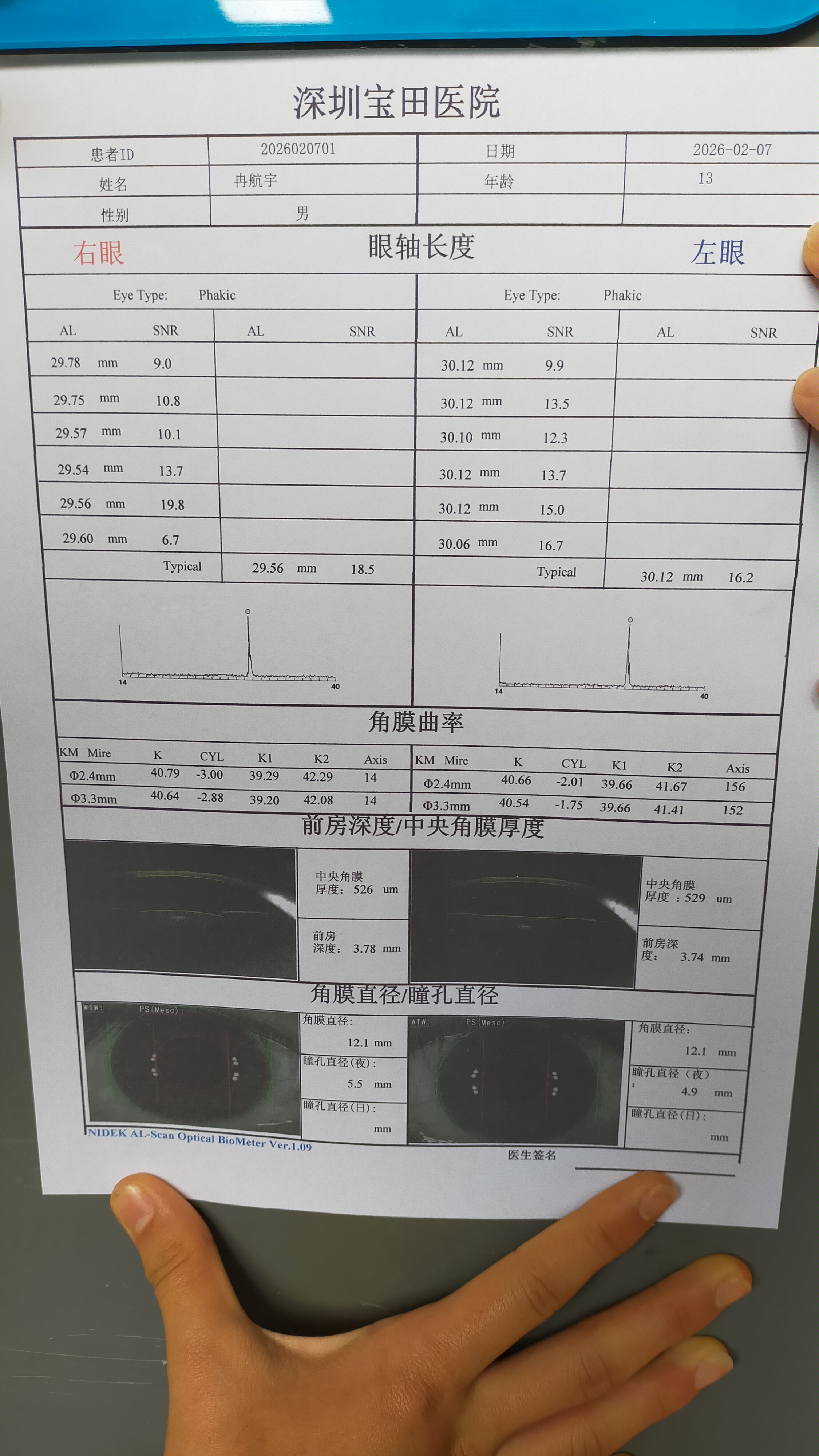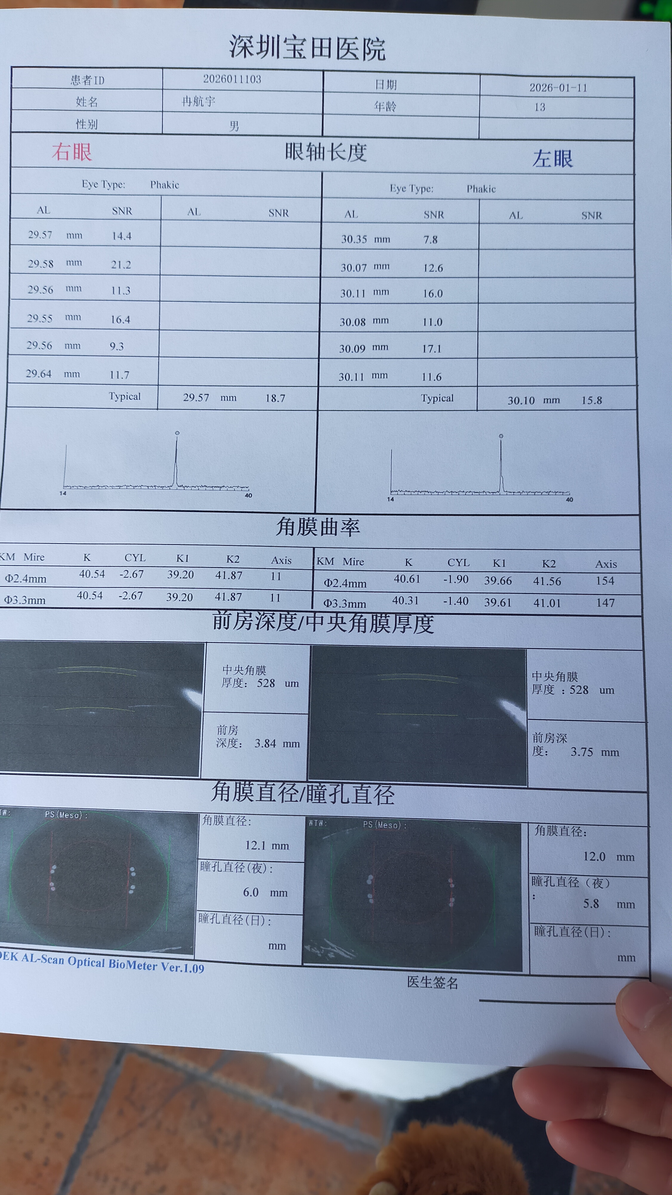 眼轴长度 29.55 mm 30.07 mm 23.33 mm(13岁标准) 严重超出安全范围,提示病理性近视风险高