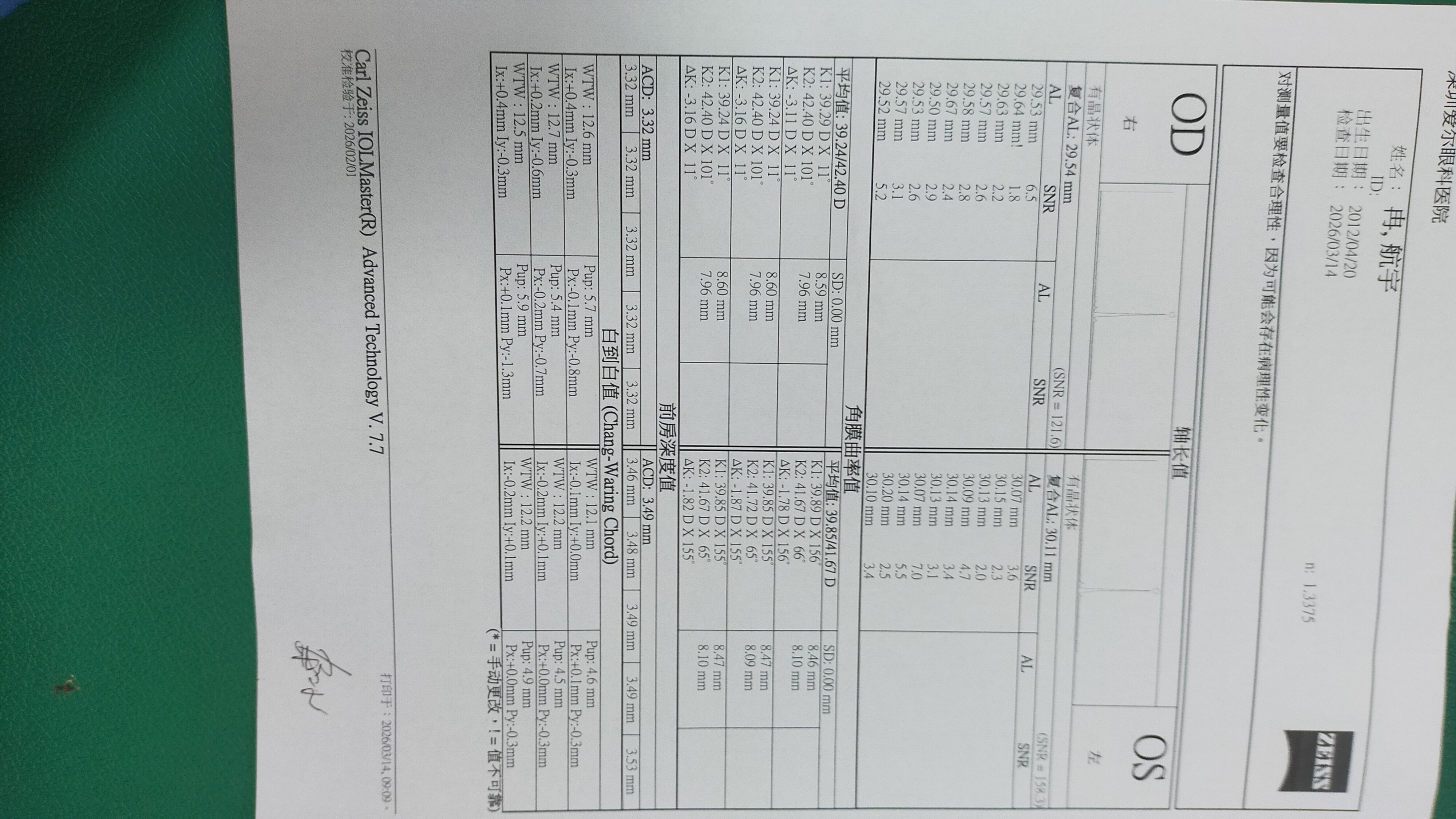 • 散光分析:右眼角膜散光2.74D(轴位垂直),属中高度散光,可能影响视觉质量,但低度数顺规散光通常无需足矫。