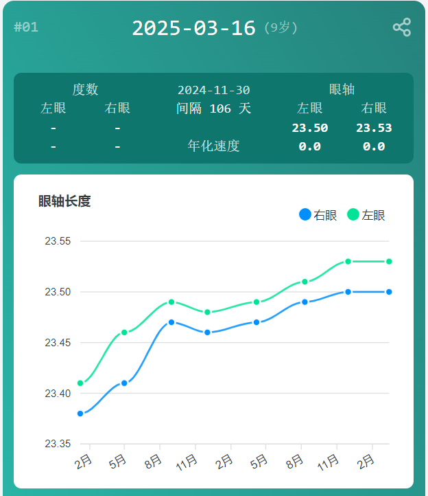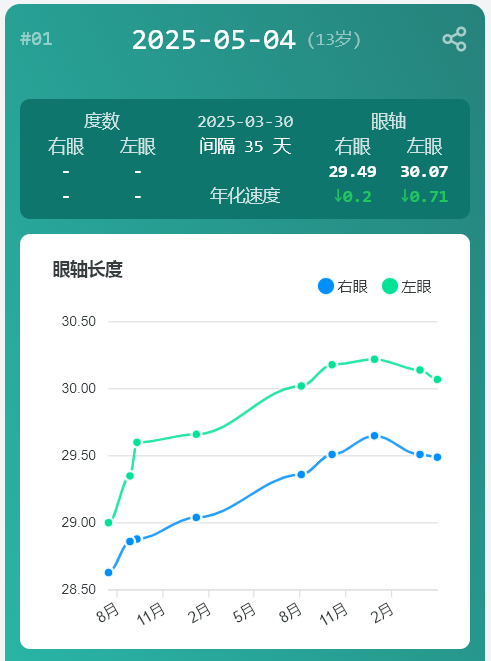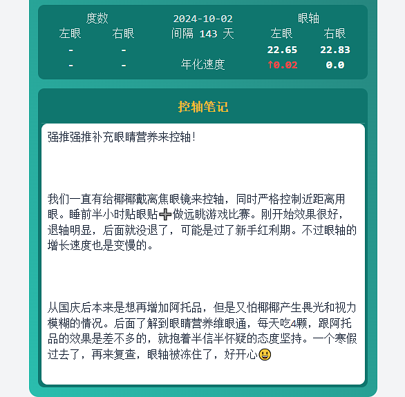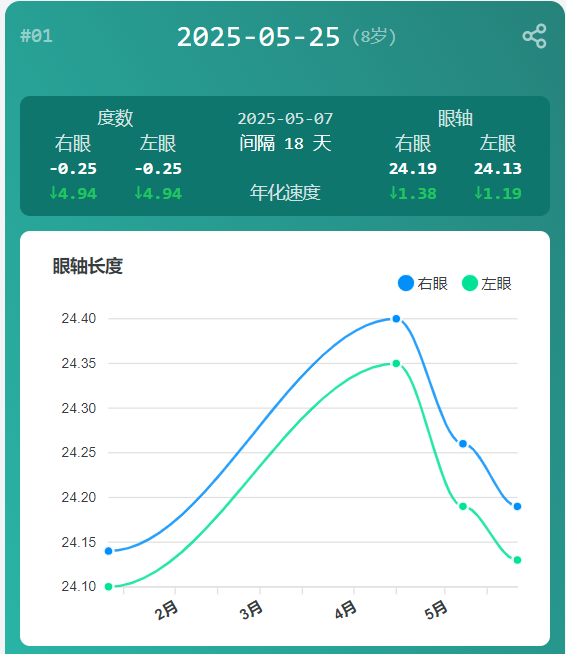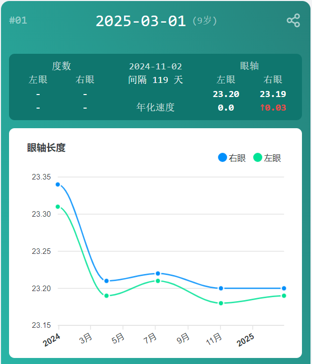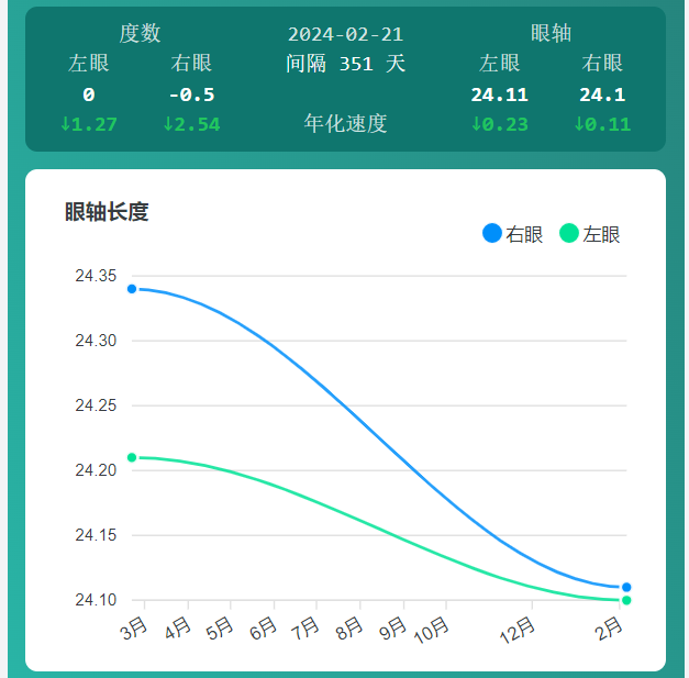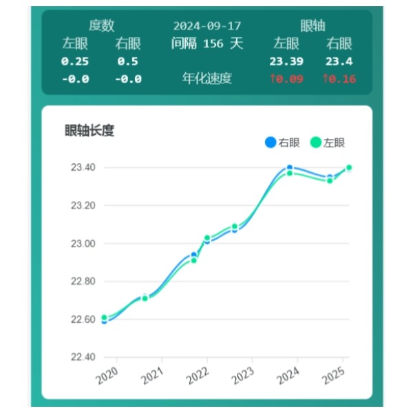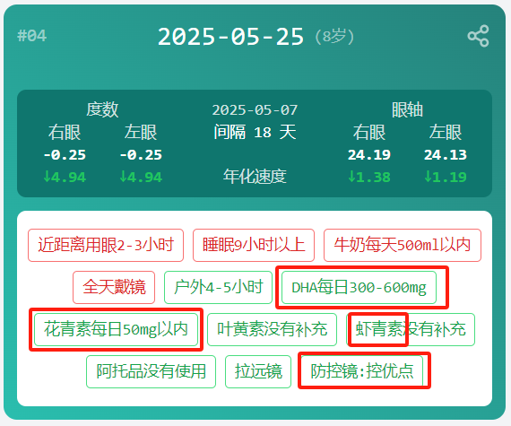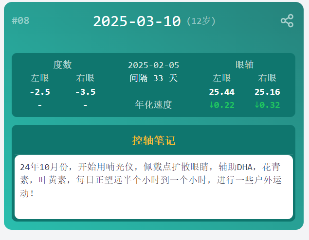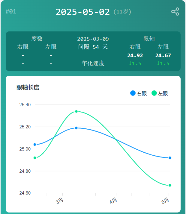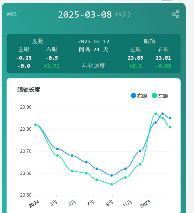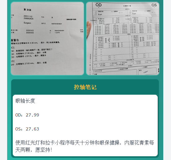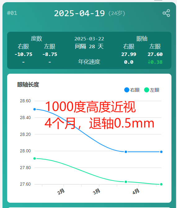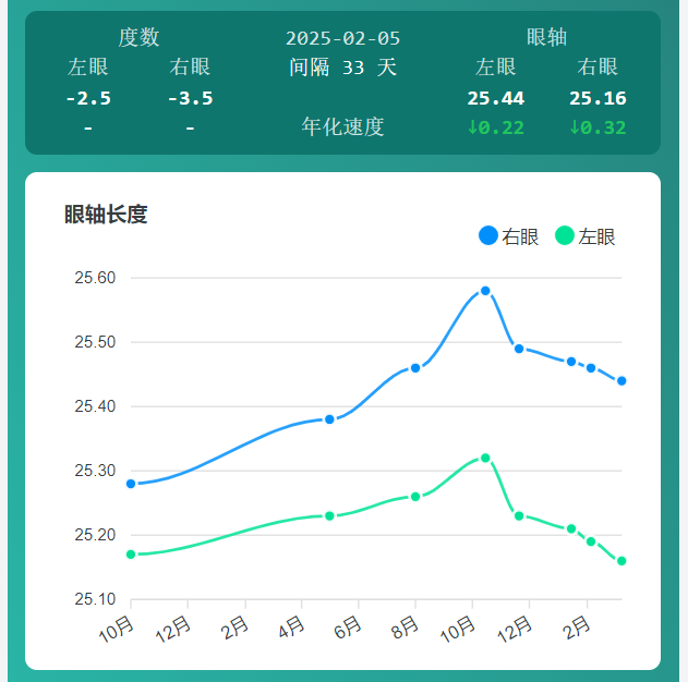 眼轴过度发育,发现时眼轴已经25+,从24年10月开始,上哺光仪注重增加脉络膜供血+营养素,眼轴开始稳步回缩。