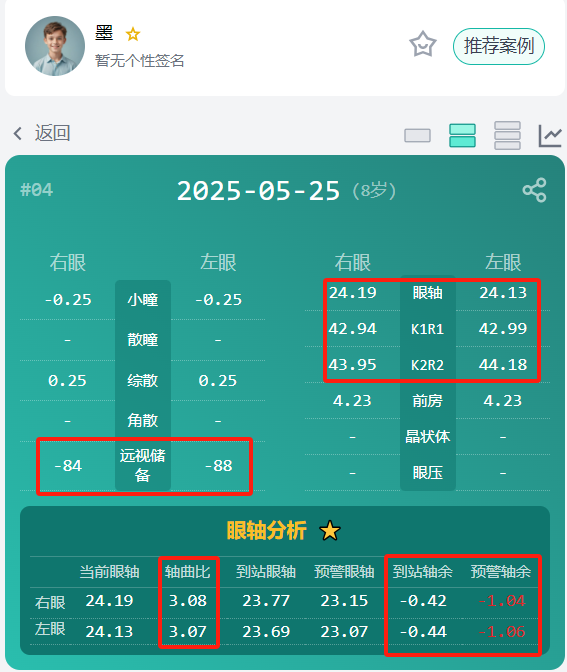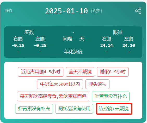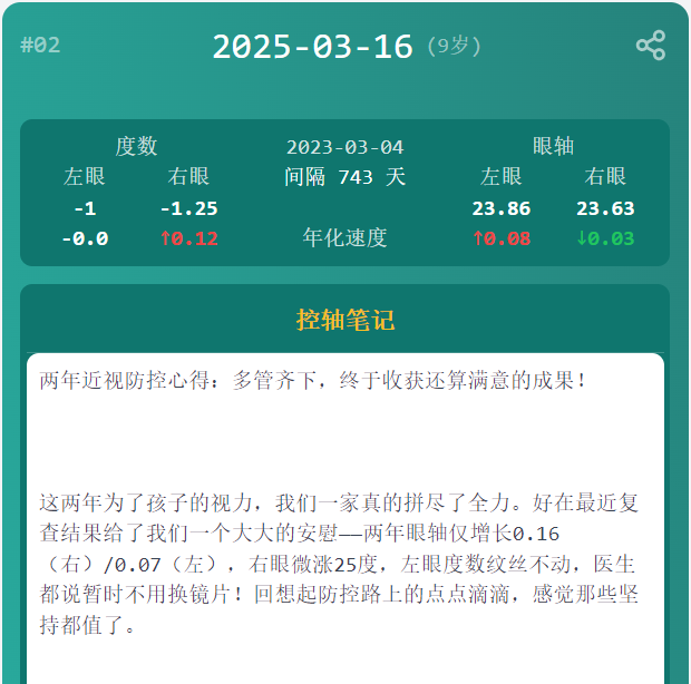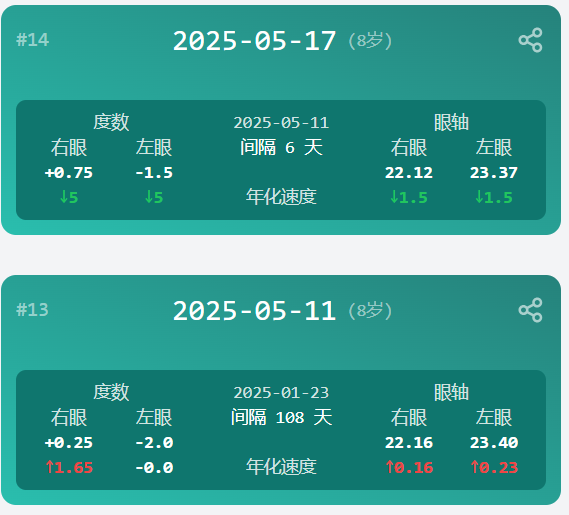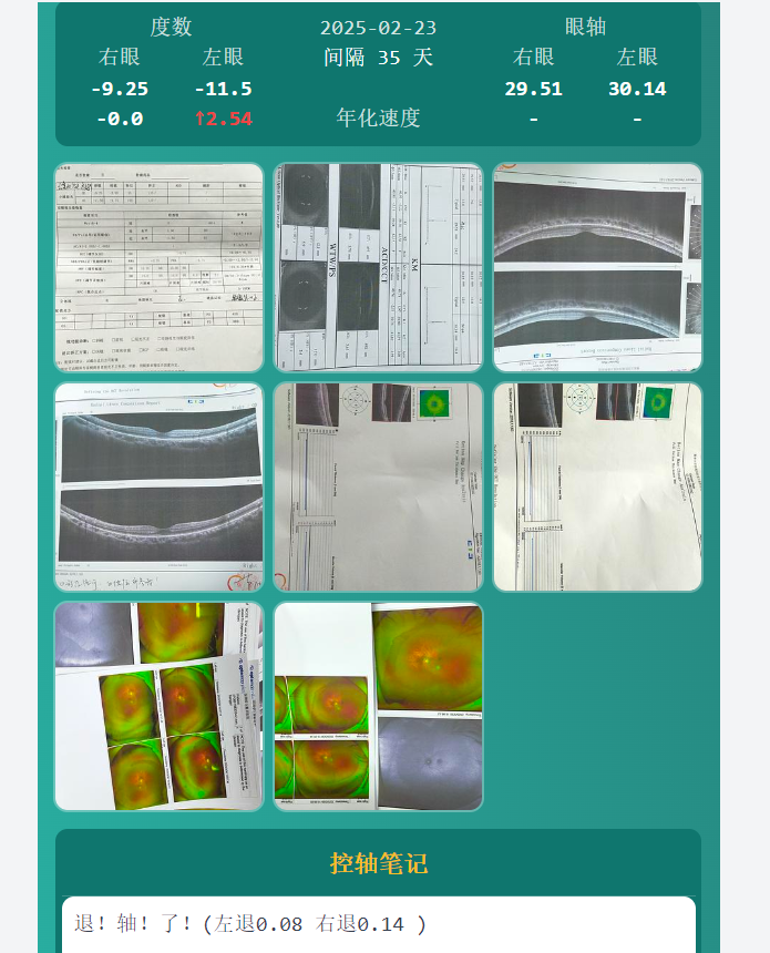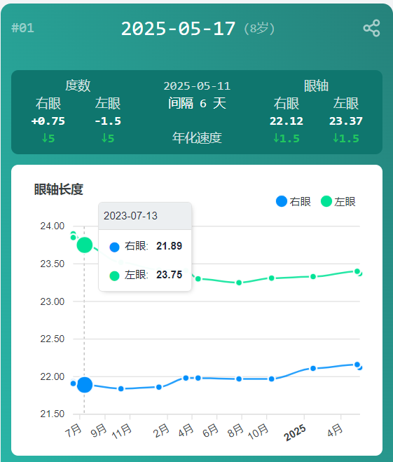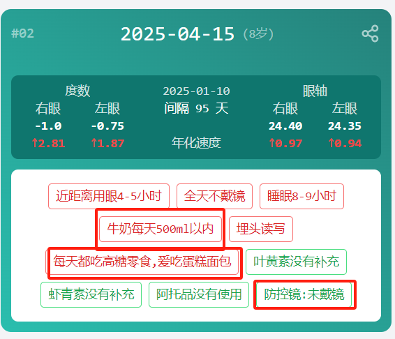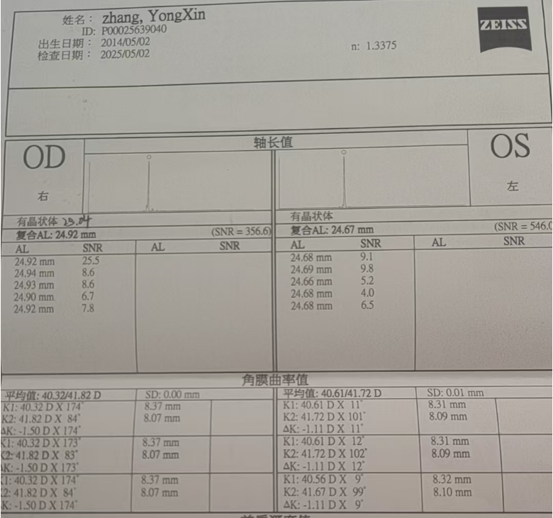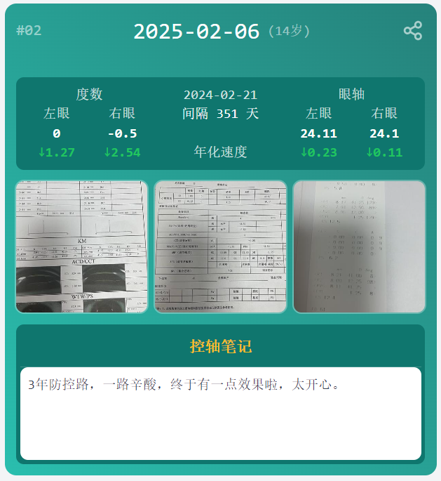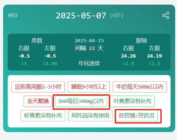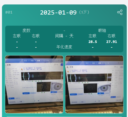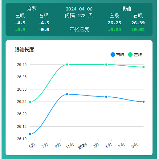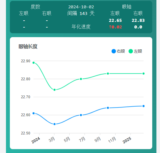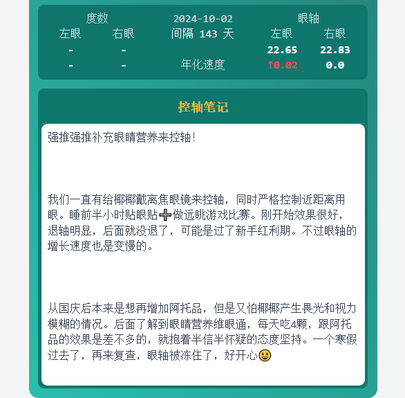 眼轴过度发育,发现时眼轴已经25+,从24年10月开始,上哺光仪注重增加脉络膜供血+营养素,眼轴开始稳步回缩。