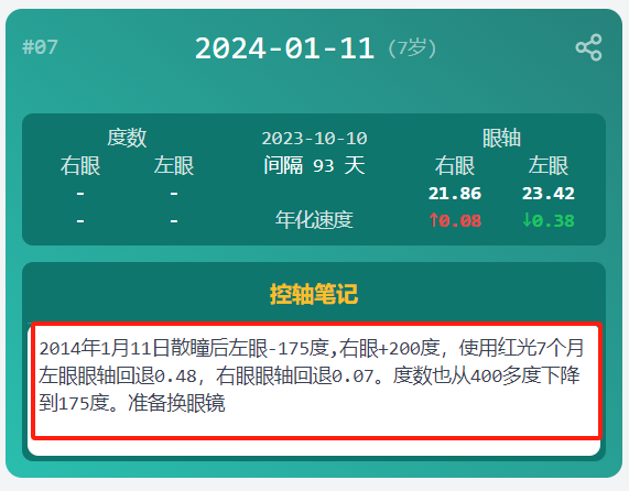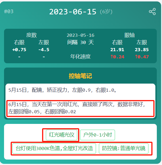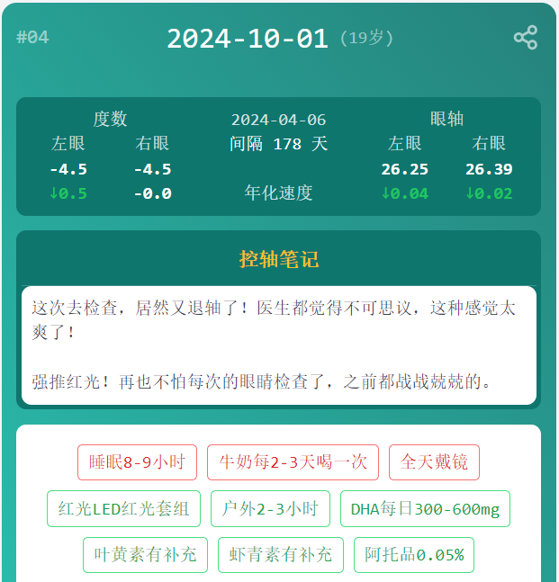 从23年开始使用红光,持续退轴案例,中途也有少量的生理性生长,如果结合营养素,应该会更好。