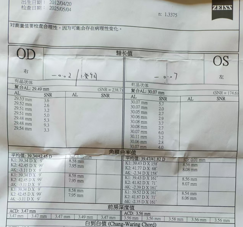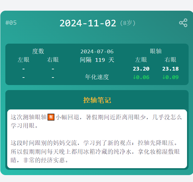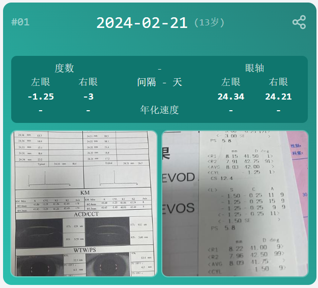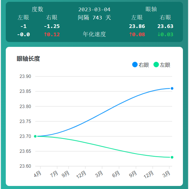 单眼退轴,坚持"户外+OK镜+阿托品+花青素"四件套,但防控方案还有优化,眼轴还有很大的提升空间。